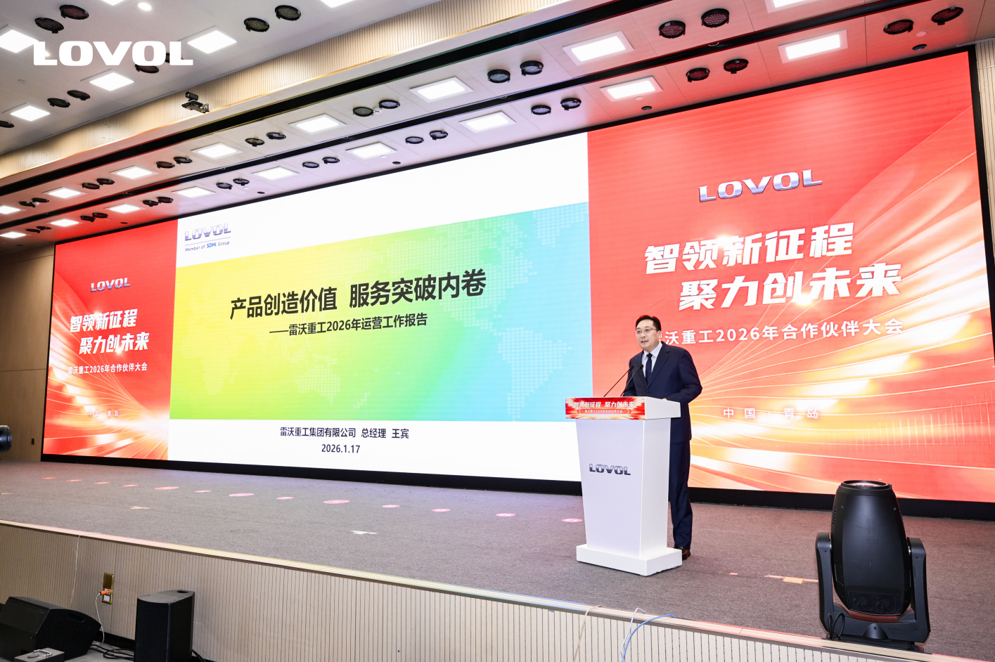 1月17日,以“智領新征程 聚力創未來”為主題的雷沃重工2026年合作伙伴大會在青島舉行。會上,雷沃重工黨委書記、董事長郎俊宇出席大會并致辭。雷沃重工總經理王賓作年度工作報告。來自全國各地的合作伙伴齊聚雷沃,共話過往收獲,共享市場機遇,共繪未來藍圖。
