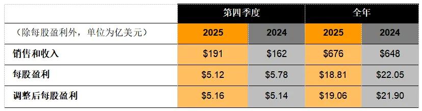 盈利指標方面,2025年全年營業利潤率為16.5%,調整后營業利潤率為17.2%;2024年這兩項指標分別為20.2%和20.7%。2025年全年每股盈利為18.81美元,調整后每股盈利為19.06美元;2024年則分別為22.05美元和21.90美元。